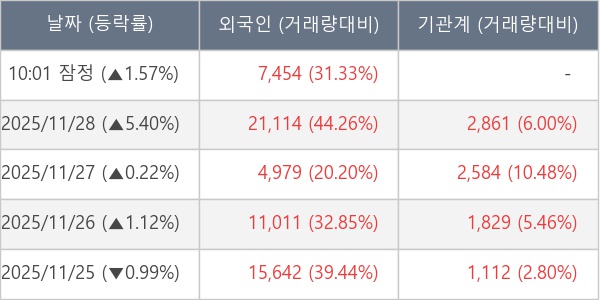 [서울=뉴스핌] 로보뉴스 = 01일 10시 15분 현재 자이언트스텝(289220)은 전일 대비 1.57% (현재가 4,860원) 상승했고, 외국인이 최근 6일 연속 순매수(누적 61,553주, 잠정) 행진을 하고 있다.