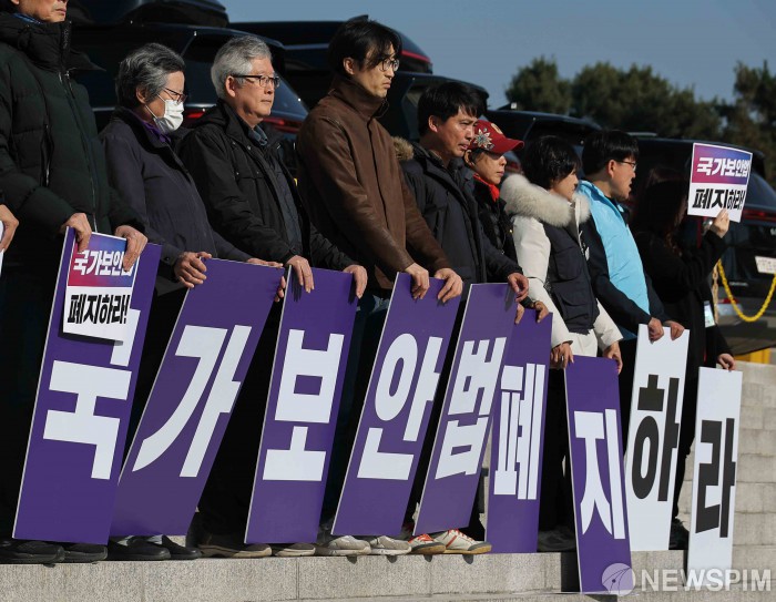[서울=뉴스핌] 윤창빈 기자 = 국가보안법폐지국민행동 등 시민사회 단체가 1일 서울 여의도 국회 본청 앞에서 열린 국가보안법 제정 77년, 22대 국회 국가보안법 폐지 법률안 발의 기자회견에서 피켓을 들고 있다. 2025.12.01 pangbin@newspim.com