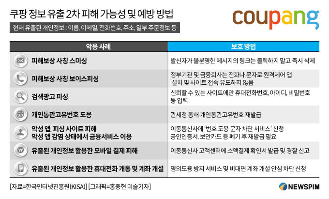 [서울=뉴스핌] 조민교 기자 = 쿠팡에서 대규모 개인정보 유출 사태가 발생한 가운데 이를 활용한 2차 피해 우려가 제기되고 있다. 쿠팡에 따르면 결제정보 등 민감 정보는 유출되지 않았지만 이미 노출된 이름·연락처·주소 등 정보만으로도 스미싱, 보이스피싱, 위장 택배 안내 문자, 구매 이력 기반 허위 상담 전화 등 맞춤형 악용 사기가 발생할 수 있다. 특히 유출 정보가 실제 소비생활과 연결돼 있어 범죄 조직이 안내 메시지로 위장해 접근할 경우 일반 사용자가 구분하기 어렵다는 우려가 나온다.