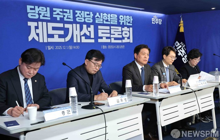 [서울=뉴스핌] 윤창빈 기자 = 조승래 더불어민주당 대의원 및 전략지역 당원 역할 재창립 TF 단장이 1일 서울 여의도 민주당 중앙당사에서 열린 당원주권정당 실현을 위한 제도개선 토론회에서 인사말을 하고 있다. 2025.12.01 pangbin@newspim.com