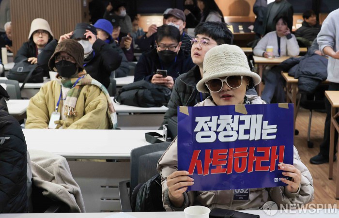 [서울=뉴스핌] 윤창빈 기자 = 1일 서울 여의도 더불어민주당 중앙당사에서 열린 당원주권정당 실현을 위한 제도개선 토론회에서 한 당원이 정청래 당대표의 사퇴를 촉구하는 피켓을 들고 있다. 2025.12.01 pangbin@newspim.com