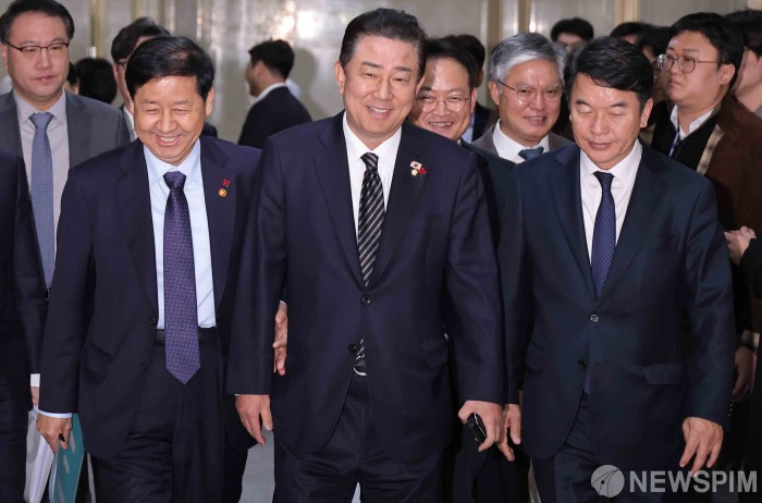 [서울=뉴스핌] 윤창빈 기자 = 김병기 더불어민주당 원내대표, 문진석 원내수석부대표, 구윤철 부총리 겸 기획재정부 장관이 1일 서울 여의도 국회에서 국민의힘과 내년도 예산안 협의를 하기 위해 들어서고 있다. 2025.12.01 pangbin@newspim.com