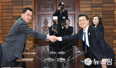 [서울=뉴스핌] 이주태(오른쪽) 남북하나재단 사무총장이 통일부 교류협력국장으로 일하던 지난 2018년 2월 27일 판문점 북측 지역 통일각에서 열린 평창 동계패럴림픽대회 실무회담에 수석대표로 참석해 황충성 북측 단장과 악수하고 있다. [사진=통일부]2025.12.02