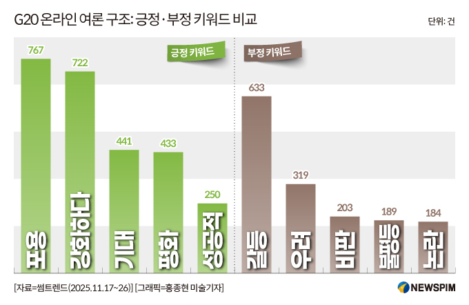 이번 G20 회의에서 2026년 미국 → 2027년 영국 → 2028년 대한민국 순으로 의장국이 확정된 점 역시 긍정적 반응을 이끌었다. '기여하다'(191건), '환영하다'(78건), '많은 관심'(91건) 등의 키워드가 증가하며 외교적 성취를 평가하는 흐름이 강화됐다.