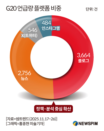 [서울=뉴스핌] 박성준 박찬제 김종원 선임기자 = 이재명 대통령의 중동·아프리카 4개국 순방과 남아프리카공화국 G20 정상회의를 계기로 온라인에서도 'G20' 관련 담론이 크게 요동친 것으로 나타났다. 인스타그램·뉴스·블로그·X(옛 트위터) 등 소셜 플랫폼에서 지난달 17일부터 같은달 26일까지 10일간 집계된 'G20' 언급량은 총 7450건에 달했다.
