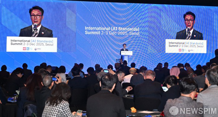 [서울=뉴스핌] 청사사진기자단 =김민석 국무총리가 2일 오전 서울 중구 신라호텔에서 열린 2025 국제 AI 표준 서밋 개회식에서 환영사를 하고 있다. 2025.12.02 photo@newspim.com