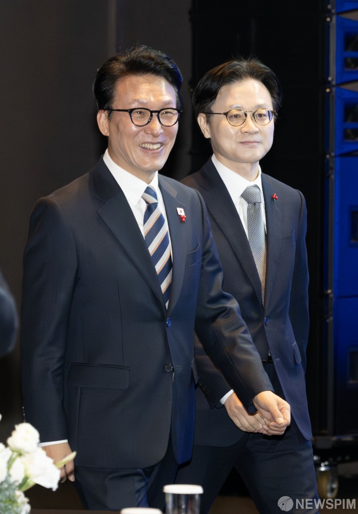 [서울=뉴스핌] 청사사진기자단 = 김민석(왼쪽) 국무총리와 김정관 산업통상자원부 장관이 2일 오전 서울 중구 신라호텔 다이너스티홀에서 열린 2025 국제 AI 표준 서밋 개회식에 참석하고 있다.2025.12.02 photo@newspim.com .