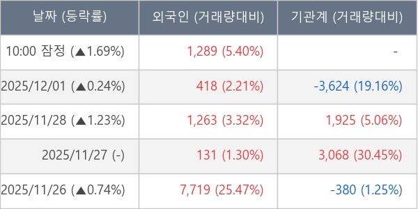 [서울=뉴스핌] 로보뉴스 = 02일 10시 15분 현재 구영테크(053270)는 전일 대비 1.69% (현재가 2,105원) 상승했고, 외국인이 최근 5일 연속 순매수(누적 10,820주, 잠정) 행진을 하고 있다.