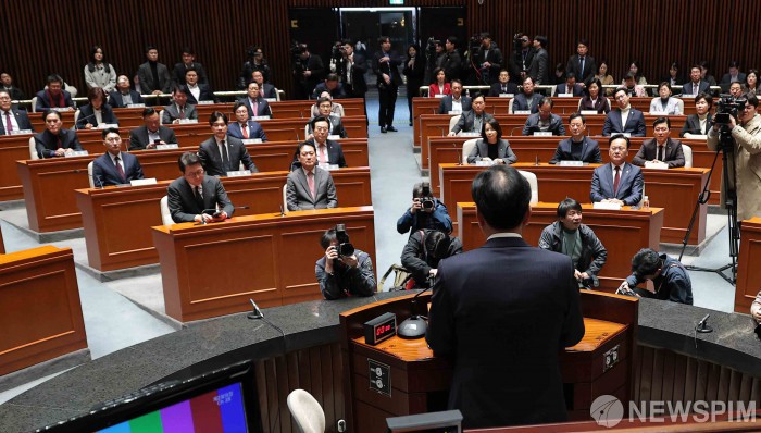 [서울=뉴스핌] 윤창빈 기자 = 송언석 국민의힘 원내대표가 2일 서울 여의도 국회에서 열린 의원총회에서 모두발언을 하고 있다. 2025.12.02 pangbin@newspim.com