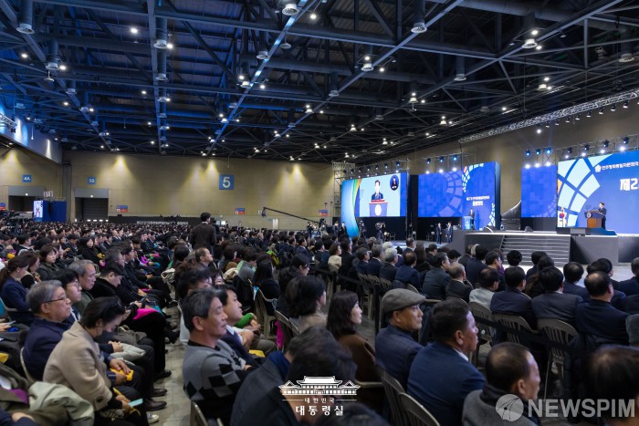 [서울=뉴스핌] 이재명 대통령이 2일 경기도 고양 킨텍스에서 열린 제22기 민주평화통일자문회의 출범식에서 연설을 하고 있다. [사진=대통령실] 2025.12.02 photo@newspim.com