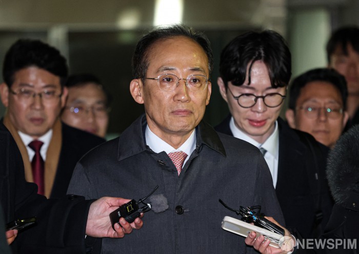 [서울=뉴스핌] 최지환 기자 = 국회의 12·3 비상계엄 해제 의결 방해 의혹을 받는 추경호 전 국민의힘 원내대표가 3일 새벽 서울 서초구 서울중앙지방법원에서 열린 영장실질심사(구속 전 피의자 심문)를 마치고 법정을 나서고 있다. 2025.12.03 choipix16@newspim.com
