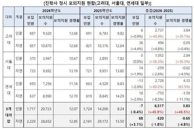 3일 진학사가 ▲고려대 ▲서울대 ▲연세대 정시모집에 모의지원한 데이터를 분석한 결과, 자연계열 모의지원은 전년 대비 감소한 반면 인문계열은 크게 증가한 것으로 확인됐다.