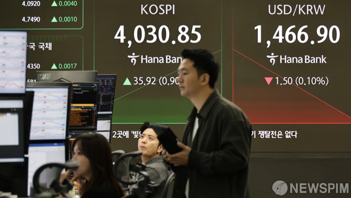 [서울=뉴스핌] 양윤모 기자 = 3일 오전 코스피가 전장 종가보다 35.92 포인트(0.90%) 상승하며 4030.85로, 코스닥은 2.97 포인트(0.32%) 상승한 931.39로 장을 시작한 가운데, 서울 중구 하나은행 딜링룸에서 직원들이 업무를 보고 있다. 서울외환시장에서 달러/원 환율은 전장 대비 1.50원 하락한 1466.90원에 주간거래를 시작했다. 2025.12.03 yym58@newspim.com