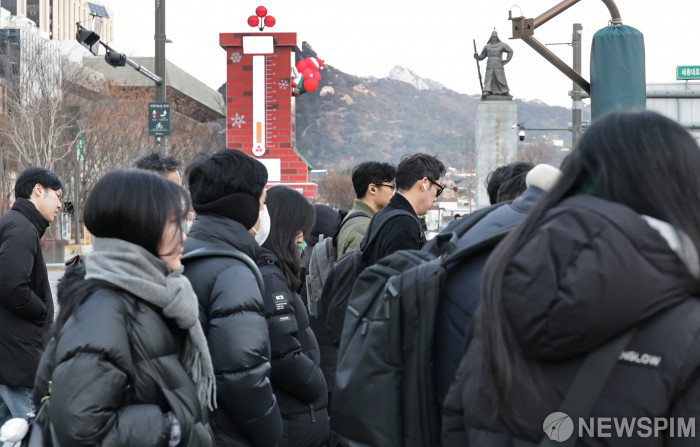 [서울=뉴스핌] 양윤모 기자 = 서울의 체감온도가 영하 12도까지 내려가며 한파특보가 발효된 3일 오전 서울 종로구 세종대로사거리에서 시민들이 칼바람을 맞으며 출근을 하고 있다. 2025.12.03 yym58@newspim.com