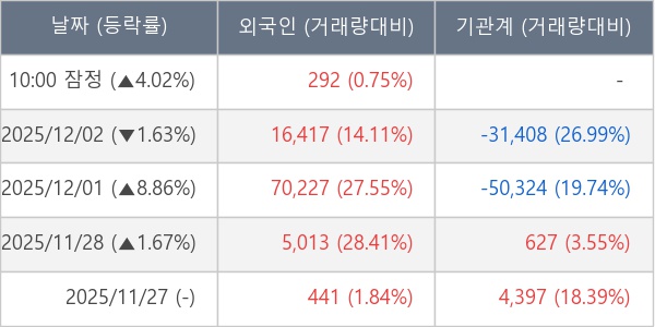 [서울=뉴스핌] 로보뉴스 = 03일 10시 15분 현재 아스플로(159010)는 전일 대비 4.02% (현재가 4,400원) 상승했고, 외국인이 최근 7일 연속 순매수(누적 95,431주, 잠정) 행진을 하고 있다.