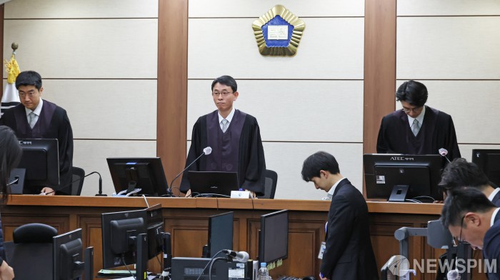 [서울=뉴스핌] 사진공동취재단 = 도이치모터스 주가조작과 명태균 공천개입, 통일교 청탁·뇌물 수수 의혹 혐의 등으로 구속기소 된 김건희 여사의 결심공판이 3일 서울 서초구 서울중앙지방법원에서 열렸다. 우인성 부장 판사(가운데)가 법정에 들어오고 있다. 2025.12.03 photo@newspim.com