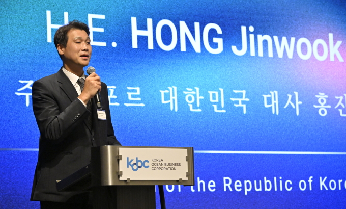 홍진욱 주싱가포르대사가 3일(현지시간) 싱가포르 웨스틴호텔에서 열린 한국해양진흥공사 싱가포르지사 개소식에서 축사를 하고 있다. [사진=해양진흥공사] 2025.12.03 dream@newspim.com