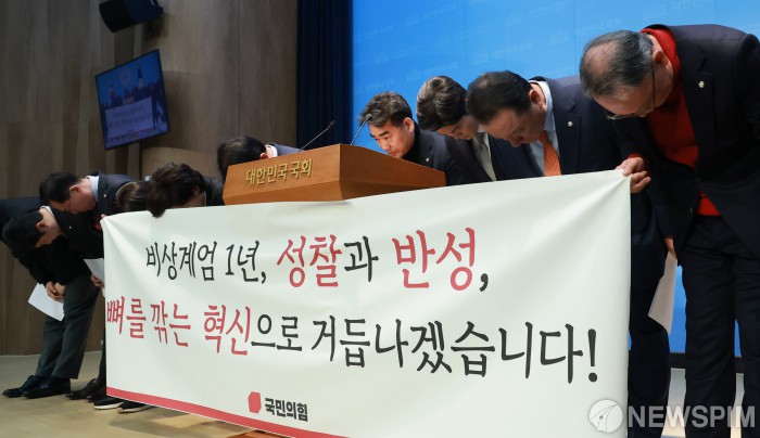 [서울=뉴스핌] 김학선 기자 = 이성권, 김용태 의원을 비롯한 국민의힘 초·재선 의원들이 3일 서울 여의도 국회 소통관에서 가진 비상계엄 1년 성찰과 반성 기자회견에서 고개 숙여 사과하고 있다. 2025.12.03 yooksa@newspim.com
