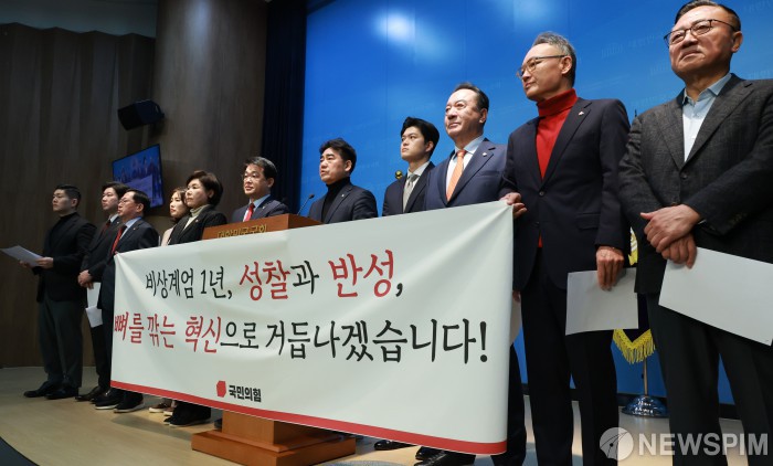 [서울=뉴스핌] 김학선 기자 = 이성권, 김용태 의원을 비롯한 국민의힘 초·재선 의원들이 3일 서울 여의도 국회 소통관에서 '비상계엄 1년, 성찰과 반성 기자회견'을 하고 있다. 2025.12.03 yooksa@newspim.com