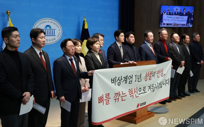 [서울=뉴스핌] 김학선 기자 = 김용태 의원을 비롯한 국민의힘 초·재선 의원들이 3일 서울 여의도 국회 소통관에서 '비상계엄 1년, 성찰과 반성 기자회견'을 하고 있다. 2025.12.03 yooksa@newspim.com
