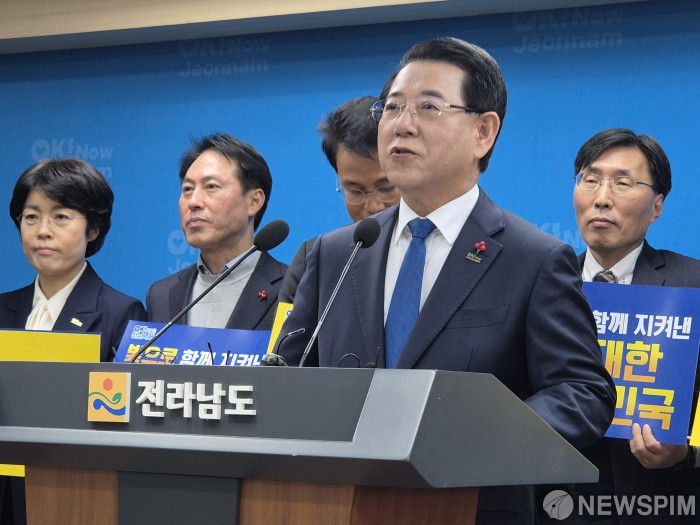 [무안=뉴스핌] 조은정 기자 = 김영록 전남지사가 3일 전남도청 브리핑룸에서 '12·3 불법 비상계엄 저지 1주년' 담화문을 발표하고 있다. 실국장들은 피켓을 들고 자리를 함께했다. 2025.12.03 ej7648@newspim.com