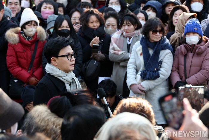 [서울=뉴스핌] 최지환 기자 = 한동훈 전 국민의힘 대표가 3일 오후 여의도 국회 국회도서관 앞에서 열린 12.3 비상계엄 1주년 관련 기자회견에서 발언하고 있다. 2025.12.03 choipix16@newspim.com