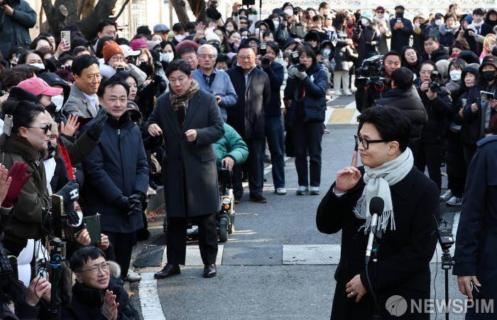 [서울=뉴스핌] 최지환 기자 = 한동훈 전 국민의힘 대표가 3일 오후 여의도 국회 국회도서관 앞에서 열린 12.3 비상계엄 1주년 관련 기자회견에서 지지자들의 환호에 정숙을 부탁하고 있다. 2025.12.03 choipix16@newspim.com
