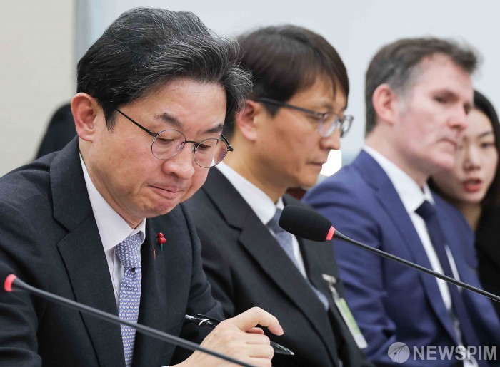 [서울=뉴스핌] 윤창빈 기자 = 이억원 금융위원장이 3일 서울 여의도 국회 정무위원회에서 열린 쿠팡 개인정보 유출 관련 현안질의에서 의원 질문을 듣고 있다. 2025.12.03 pangbin@newspim.com