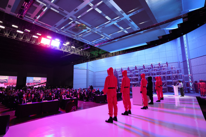 특히 유현석 콘진원 원장직무대행은 '오징어 게임' 내 세트장을 배경으로 극중 프론트맨의 의상을 입고 깜짝 등장했다. 그는 "'오징어 게임'은 스튜디오 큐브에서 전 시즌 촬영된 상징적인 작품이다. K콘텐츠의 글로벌 성공을 상기시키고, 의미를 더하기 위해 이런 퍼포먼스를 준비했다. 이번 버추얼 스튜디오 개관은 단순한 인프라 시설의 오픈이 아닌 K콘텐츠의 질적 도약을 선언하는 역사적 순간"이라고 말했다.