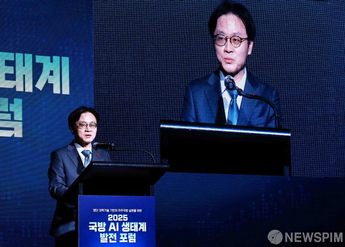 [서울=뉴스핌] 김정관 산업통상부 장관이 3일 서울 용산구 그랜드하얏트호텔에서 열린 국방 AI 생태계 발전포럼에서 축사를 하고 있다. [사진=산업통상부] 2025.12.03 photo@newspim.com