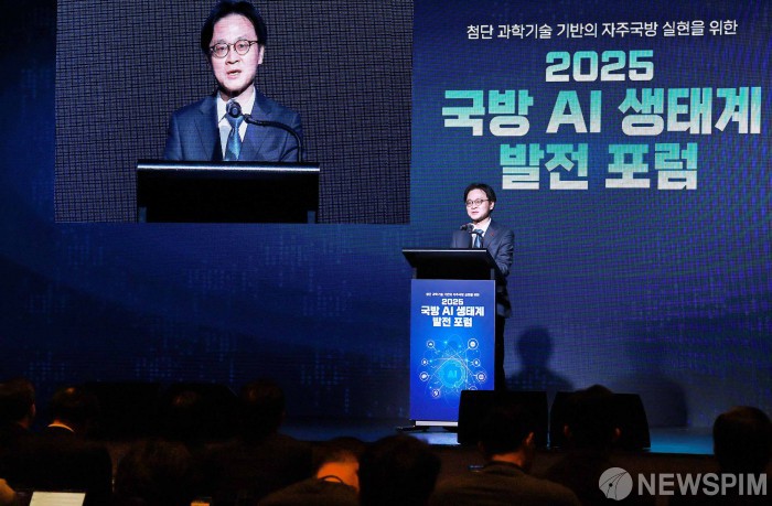 [서울=뉴스핌] 김정관 산업통상부 장관이 3일 서울 용산구 그랜드하얏트호텔에서 열린 국방 AI 생태계 발전포럼에서 축사를 하고 있다. [사진=산업통상부] 2025.12.03 photo@newspim.com