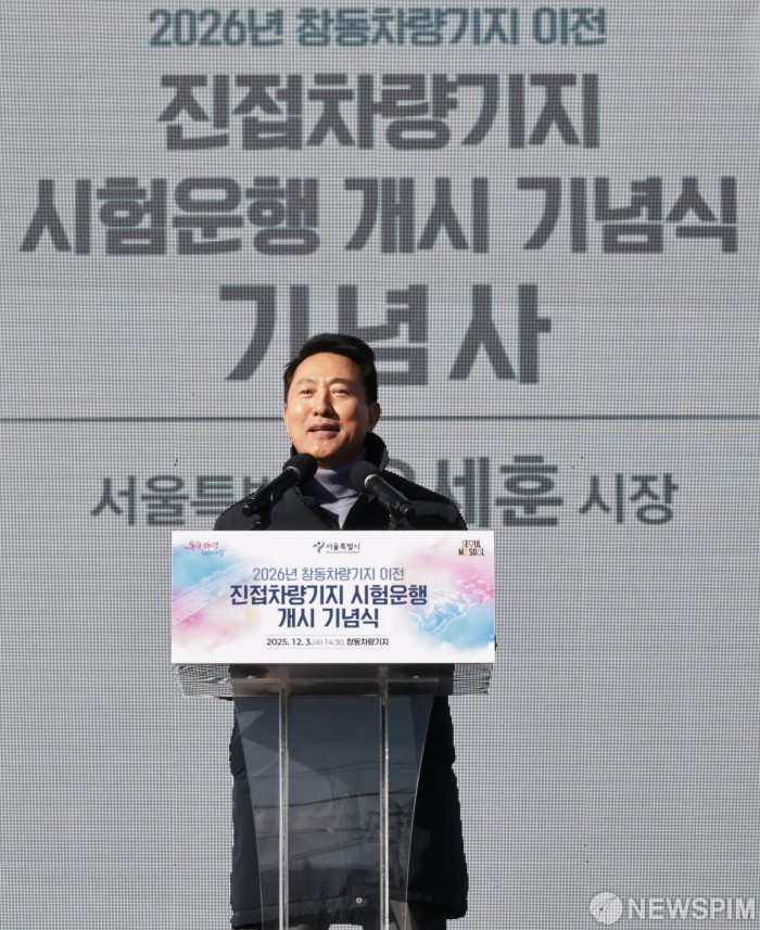 [서울=뉴스핌] 양윤모 기자 = 오세훈 서울시장이 3일 오후 서울 노원구 노원로 573번지 창동차량기지에서 개최된 2026년 창동차량기지 이전에 따른 '진접차량기지 시험운행 개시 기념식'에 참석해 기념사를 하고 있다. 진접차량기지는 2018년 착공해 지난 11월부터 종합 시험 운행 중이며, 진접으로 이동하는 창동차량기지 일대는 2028년 착공을 목표로 '강북권 대개조-강북 전성시대' 사업의 핵심인 서울디지털바이오시티(S-DBC)가 들어선다. 2025.12.03 yym58@newspim.com