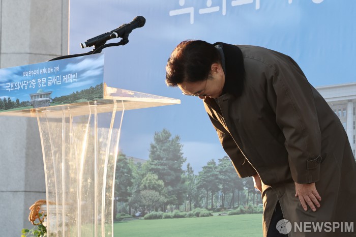 [서울=뉴스핌] 최지환 기자 = 우원식 국회의장이 3일 오후 서울 여의도 국회에서 열린 국회의사당 2층 정문 글새김 제막식에서 고개 숙여 인사하고 있다. 2025.12.03 choipix16@newspim.com