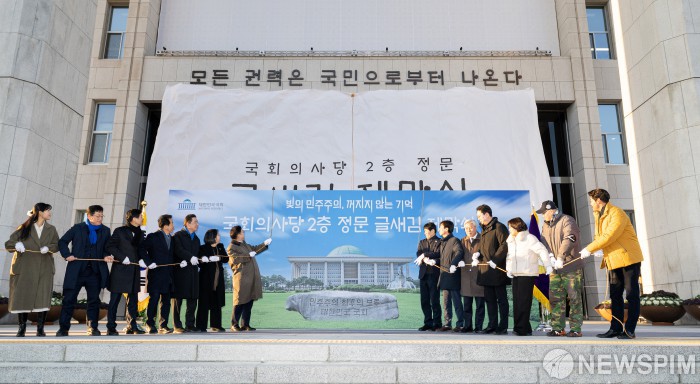 [서울=뉴스핌] 최지환 기자 = 우원식 국회의장이 3일 오후 서울 여의도 국회에서 열린 국회의사당 2층 정문 글새김 제막식에서 참가자들과 문구를 공개하고 있다. 2025.12.03 choipix16@newspim.com