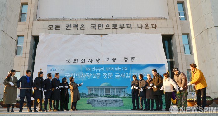 [서울=뉴스핌] 최지환 기자 = 우원식 국회의장이 3일 오후 서울 여의도 국회에서 열린 국회의사당 2층 정문 글새김 제막식에서 참가자들과 문구를 공개하고 있다. 2025.12.03 choipix16@newspim.com