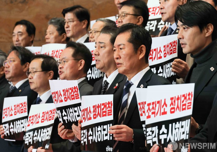 [서울=뉴스핌] 윤창빈 기자 = 정청래 더불어민주당 대표, 김병기 원내대표 등 소속 의원들이 4일 서울 여의도 국회 로텐더홀 계단에서 열린 윤석열 정치검찰의 조작기소 책임자 처벌 촉구를 위한 규탄대회에서 구호를 외치고 있다. 2025.12.04 pangbin@newspim.com