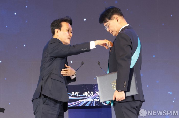 [서울=뉴스핌] 이길동 기자 = 김민석 국무총리가 4일 서울 강남구 코엑스에서 열린 제62회 무역의 날 기념식에서 정준철 현대자동차 부사장에게 금탑산업훈장을 수여하고 있다. 2025.12.04 gdlee@newspim.com
