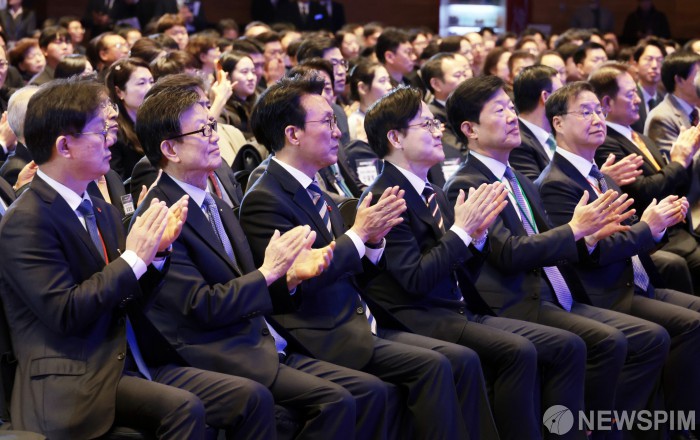 [서울=뉴스핌] 이길동 기자 = 김민석 국무총리가 4일 서울 강남구 삼성동 코엑스에서 열린 제62회 무역의 날 기념식에서 참석자들과 박수를 치고 있다. 2025.12.04 gdlee@newspim.com