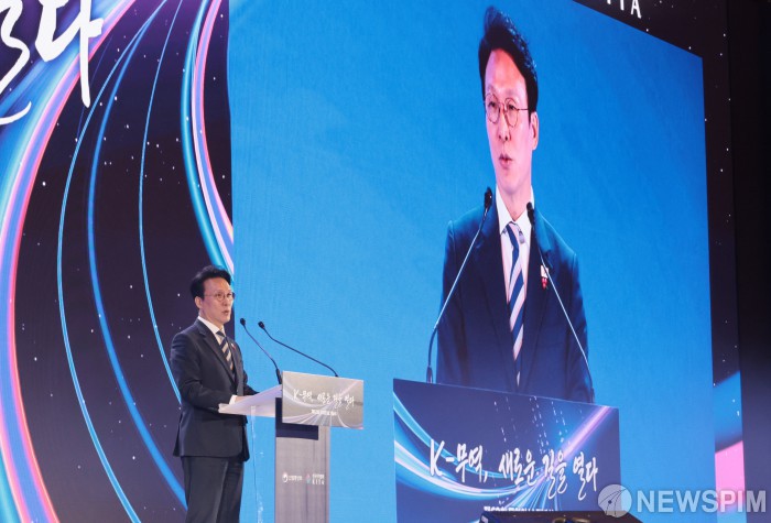 [서울=뉴스핌] 이길동 기자 = 김민석 국무총리가 4일 서울 강남구 삼성동 코엑스에서 열린 제62회 무역의 날 기념식에서 축사를 하고 있다. 2025.12.04 gdlee@newspim.com