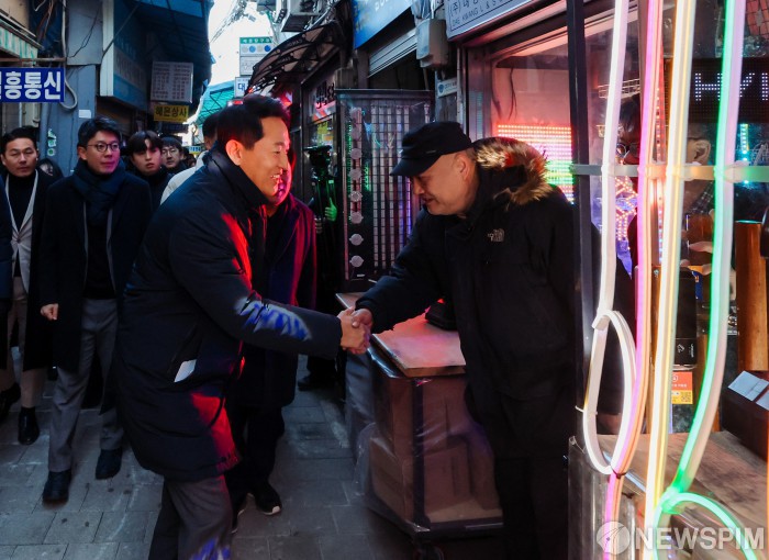 [서울=뉴스핌] 양윤모 기자 = 오세훈 서울시장이 4일 오전 서울 종로구 세운지구를 찾아 현장에서 상인과 악수하고 있다. [공동취재] 2025.12.04 yym58@newspim.com