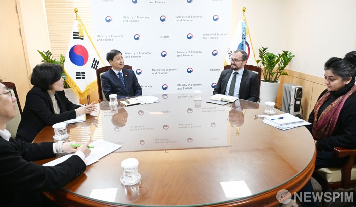 [서울=뉴스핌] 구윤철 부총리 겸 기획재정부 장관(왼쪽 세번째)이 12월 4일 오후 서울 종로구 정부서울청사에서 제레미 주크 국제신용평가사 피치(Fitch) 아태지역 국가신용등급 담당 이사와 대화를 나누고 있다. [사진=기획재정부] 2025.12.04 photo@newspim.com