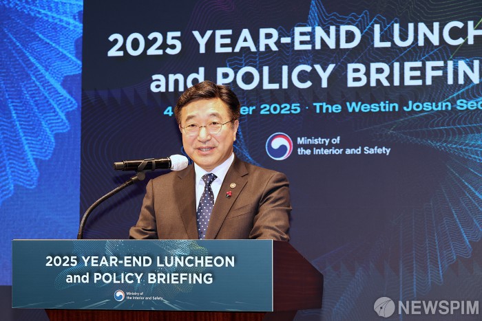 [서울=뉴스핌] 윤호중 행정안전부 장관이 4일 오전 서울 중구 웨스틴조선호텔에서 한국 공공행정의 우수성 등 행정한류의 확산을 위한 주한 외교사절 초청 정책설명회에 참석하여 환영사를 하고 있다. [사진=행정안전부] 2025.12.04 photo@newspim.com