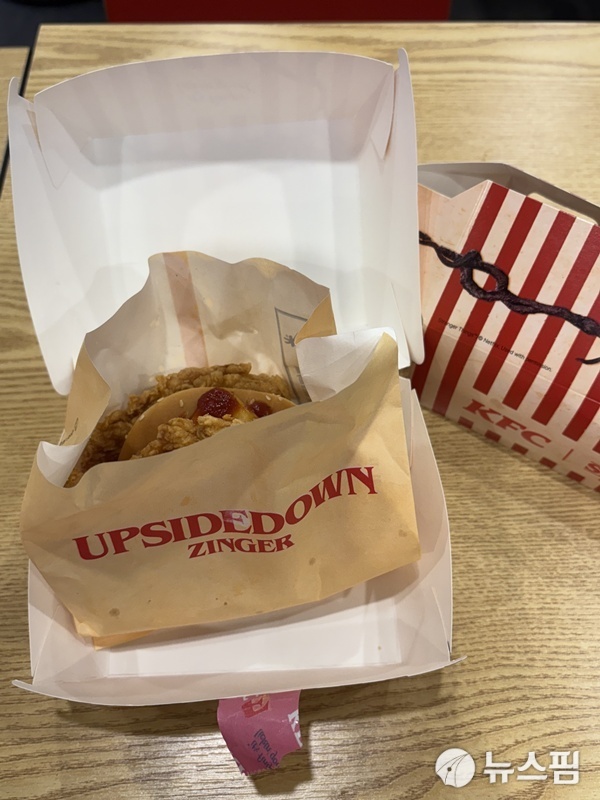 | '업사이드다운징거' 버거는 KFC 대표 메뉴 '징거'를 기묘한 이야기 세계관 관점에서 재해석한 한정판 버거다. [사진=송은정 기자] |