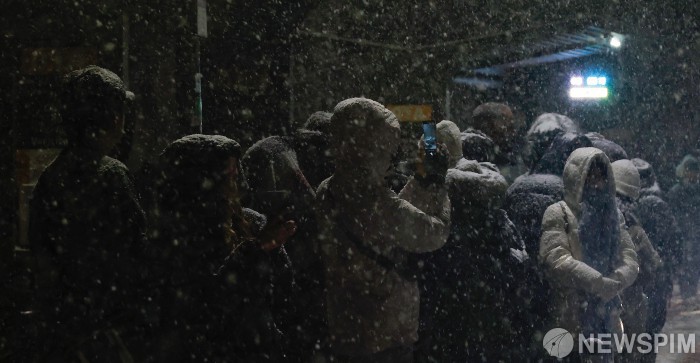 [서울=뉴스핌] 류기찬 기자 = 서울에 눈이 내리고 있는 가운데 4일 오후 서울 용산구 남산서울타워를 찾은 시민들이 버스를 기다리고 있다. 2025.12.04 ryuchan0925@newspim.com