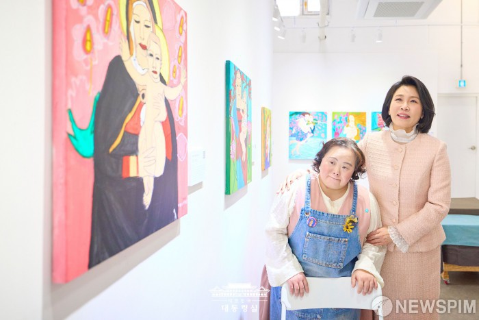 [서울=뉴스핌] 김혜경 여사가 지난 3일 경기도 양평시 어메이징 아웃사이더 아트센터에서 열린 정은혜 작가의 개인전 ‘은혜로운 명화전’을 찾아 정 작가와 작품을 둘러보고 있다. [사진=대통령실] 2025.12.04 photo@newspim.com