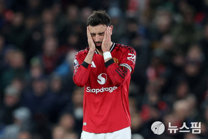 | [맨체스터 로이터=뉴스핌] 맨유의 주장 브루노 페르난데스가 5일에 열린 웨스트햄과의 EPL 14라운드 맞대결에서 후반 막판 마가사에게 동점골을 내주자 좌절하고 있다. 2025.12.05 wcn05002@newspim.com |