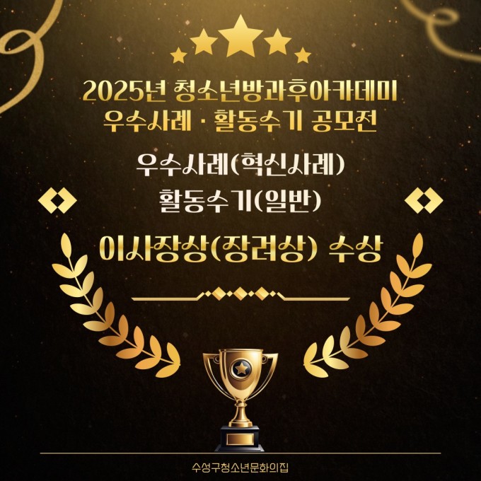 | 대구 수성구청소년문화의집은 2025년 청소년방과후아카데미 공모전에서 2관왕의 영예를 안았다.[사진=수성구] 2025.12.05 yrk525@newspim.com |