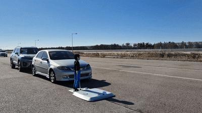 다음날엔 자동제동장치(AEBS)와 전방추돌경고 작동 과정 시연을 볼 수 있었다. 시속 60km로 주행하던 차량이 어린이 보행자 더미와 마주하는 가혹한 조건의 실험이다. AEBS를 장착한 SUV가 멀리서부터 속도를 내며 다가오자 사각지대에 가려져 있던 어린이 보행자 더미가 도로 한가운데로 갑작스레 모습을 드러냈다.