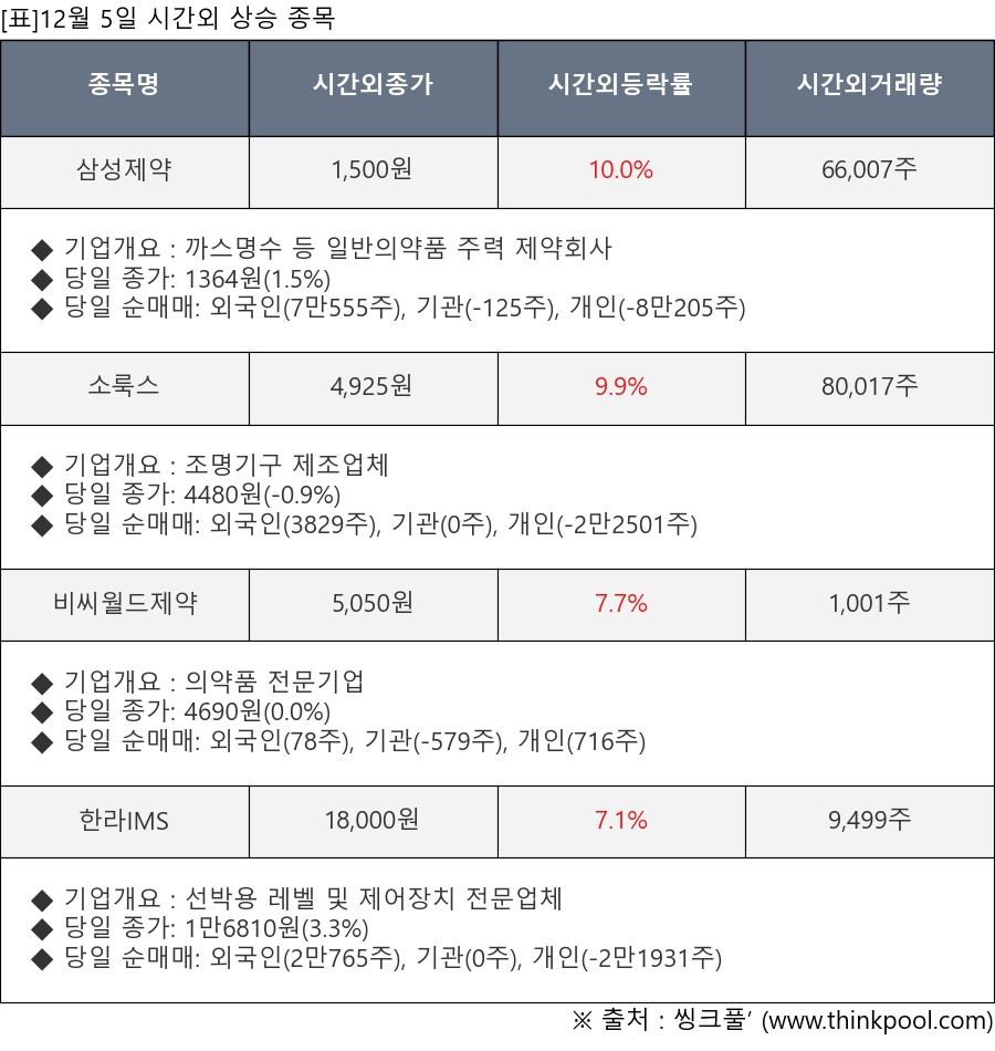 [표]12월 5일 시간외 상승 종목 및 최근 동향