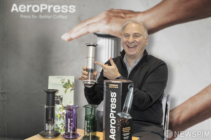 [서울=뉴스핌] 지난 6일 서울 성수동 레이어스튜디오 41에서 열린 ‘2025 월드 에어로프레스 챔피언십’ 현장에서 제라드 마이어(Gerard Meyer) 에어로프레스 CEO가 신제품 ‘에어로프레스 프리미엄’을 소개하고 있다.[사진=월드 에어로프레스 챔피언십] 2025.12.07 photo@newspim.com